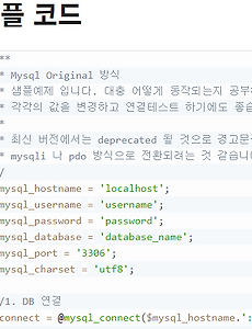 Connection4 [PHP, MYSQL] PHP + MYSQL 연결 테스트 예제 (pdo 방식) (업데이트 2017-11-24) 준비 php.ini 에서 php_pdo_mysql.dll 이 주석해제 되어 있어야 합니다. extension=php_pdo_mysql.dll 샘플 코드 /** * pdo 클래스 방식 * 샘플예제 입니다. 대충 어떻게 동작되는지 공부하시기에 좋게 정리해놓았습니다. * 각각의 값을 변경하고 연결테스트 하기에도 좋습니다. */ //0. 설정 $mysql_hostname = 'localhost'; $mysql_username = 'username'; $mysql_password = 'password'; $mysql_database = 'database_name'; $mysql_port = '3306'; $mysql_charset = 'utf8'; //1. DB 연결 $dsn = 'mysql:host='.$mys.. 2016. 2. 5. [PHP, MYSQL] PHP + MYSQL 연결 테스트 예제 (mysqli 클래스 방식) (업데이트 2017-11-24) 준비 php.ini 에서 php_mysqli.dll 이 주석해제 되어 있어야 합니다. extension=php_mysqli.dll 샘플 코드 /** * mysqli 클래스 방식 * 샘플예제 입니다. 대충 어떻게 동작되는지 공부하시기에 좋게 정리해놓았습니다. * 각각의 값을 변경하고 연결테스트 하기에도 좋습니다. */ //0. 설정 $mysql_hostname = 'localhost'; $mysql_username = 'username'; $mysql_password = 'password'; $mysql_database = 'database_name'; $mysql_port = '3306'; $mysql_charset = 'utf8'; //1. DB 연결 $connect = new mysqli($mysql.. 2016. 1. 30. [PHP,MYSQL] PHP + MYSQL 연결 테스트 예제 (original) (업데이트 2015-03-15) 개요 deprecated. 현재는 사용되지 않는 방식 입니다. PHP 5 버전까지 이용이 가능합니다. 현재는 mysqli 나 pdo 방식을 권장하고 있으며, mysqli 는 mysql 과 비슷한 방식으로 동작됩니다. 샘플 코드 /** * Mysql Original 방식 * 샘플예제 입니다. 대충 어떻게 동작되는지 공부하시기에 좋게 정리해놓았습니다. * 각각의 값을 변경하고 연결테스트 하기에도 좋습니다. * * 최신 버전에서는 deprecated 될 것으로 경고문구가 뜰 수 있습니다. * mysqli 나 pdo 방식으로 전환되려는 것 같습니다. */ $mysql_hostname = 'localhost'; $mysql_username = 'username'; $mysql_password = 'password.. 2013. 12. 3. [jsp + mysql] 연결 테스트 예제 (PreparedStatement) 2011. 5. 6. 이전 1 다음